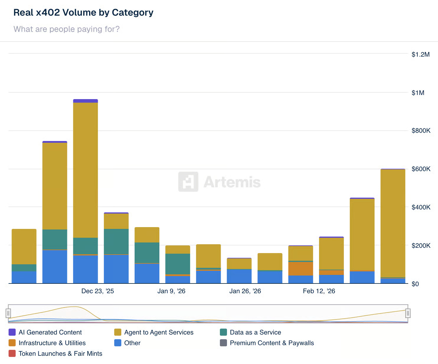 But, looking at the current numbers, the vertical is still firmly in experimentation mode. Since October last year, x402, the leading payments protocol for agents developed by Coinbase, has processed transactions worth roughly $14.5 million. The dominant use cases so far involve agents paying for digital resources such as API access, data feeds, compute, and AI-generated content.