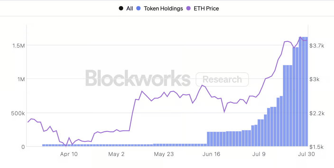 And the scale of these digital asset treasuries (DATs) is growing fast. Today, 38 publicly listed firms hold over $100 million in Bitcoin, while 5 companies have built comparable Ethereum positions. These ETH-based treasury companies, in particular, made headlines last month, acquiring approximately $6 billion in ETH, contributing meaningfully to Ethereum’s 55% price surge in July.