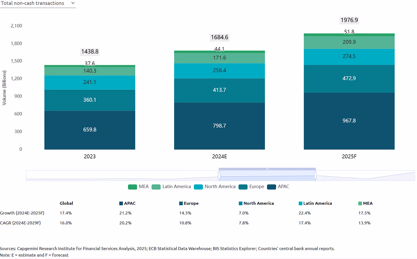 In the United States, card payments already make up roughly 63% of monthly consumer payments by number when you look at cash, cards and electronic transfers together. The euro area and the broader European Union look similar in pattern, even if the mix between cards and instant payments differs. Non-cash volumes are growing faster than GDP and cash’s share of point-of-sale transactions keeps falling.